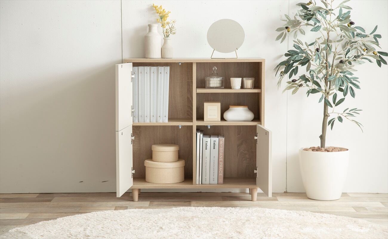 隠す収納、見せる収納を兼ね備えた2色使いのスクエアキャビネット。