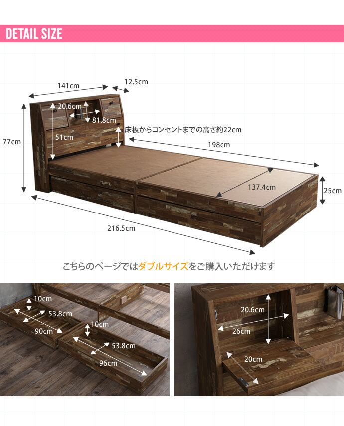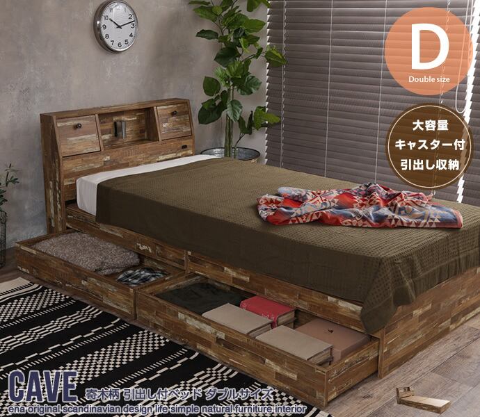 【送料無料】Cave ダブルベッド フレーム&マットレス付き コンセント 収納 キャスター 引き出し 読書灯付き