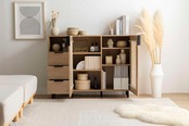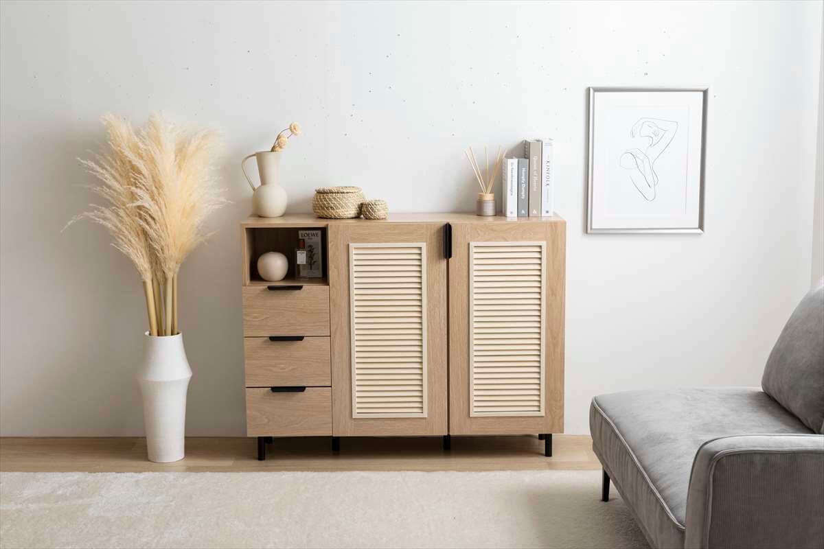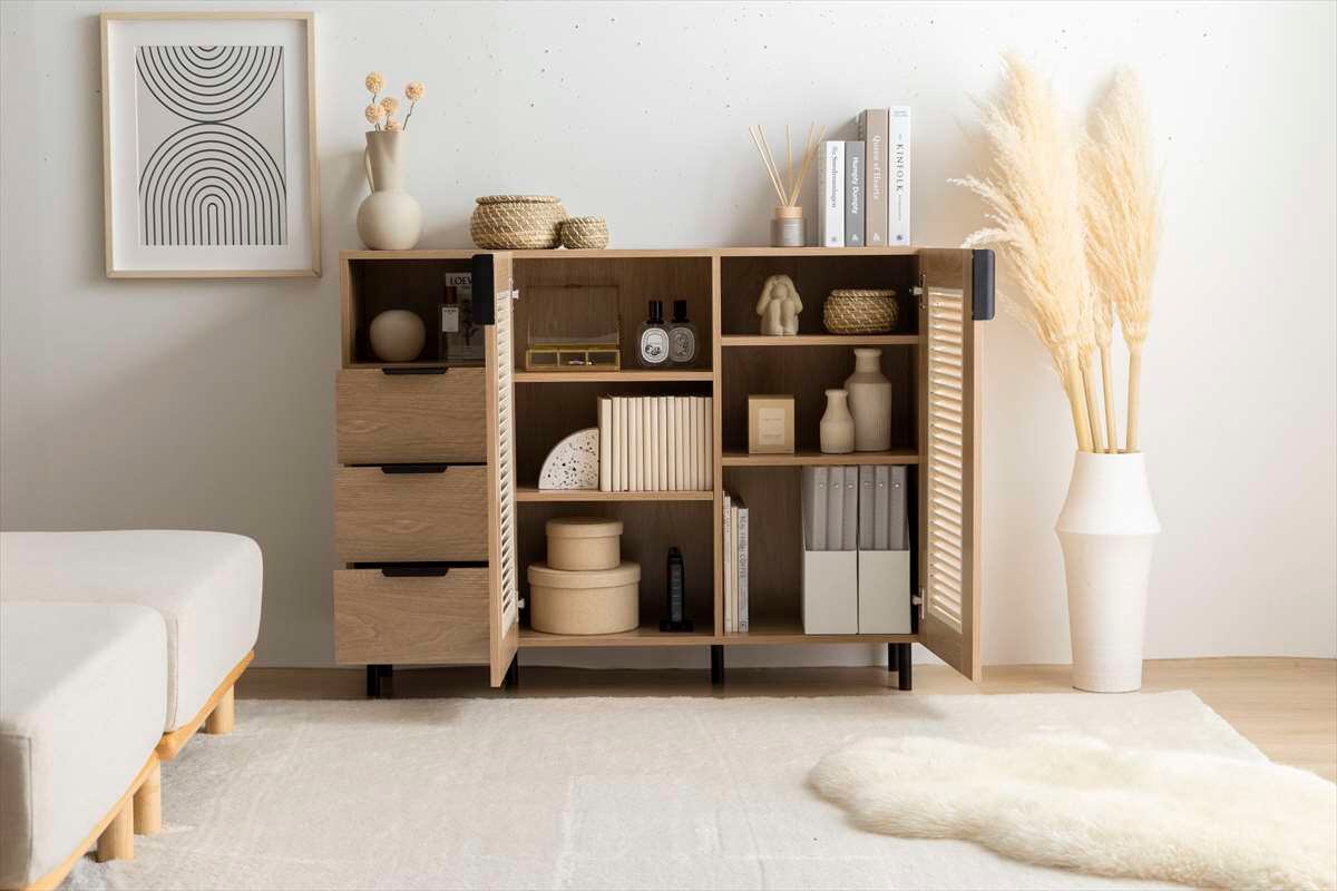 ナチュラルな木目にルーバーデザインをさりげなくあしらった『Coffea(コフェア)』シリーズのキャビネット