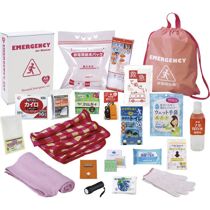 女性ならではの必需品を揃えた防災セット。棚に常備しやすいA4サイズのパッケージ入