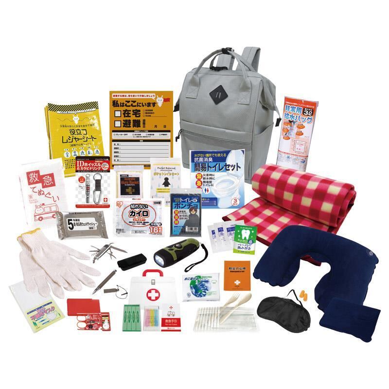 収納リュック(約190×290×360mm)×1、タッチペン・防災の心得・IDホイッスル&カラビナリング・カイロ・レインコート・抗菌消臭簡易トイレ3回分・トイレポンチョ・ダイナモマルチライト・モバイルバッテリー(乾電池式)・ペーパー歯みがき1日分・軍手・アルミブランケット・ブランケット・救急てぬぐい・マスク・防災用ウェットティッシュ・ネックピロー・アイマスク・耳栓・レジャーシート・カトラリーセット・8徳ナイフ・給水袋3L・ソーイングセット・緊急避難カード・水に流せるペーパー・救急4点セット×各1